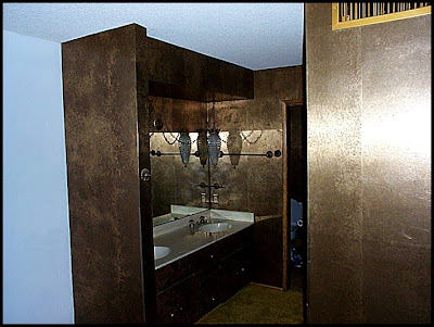 More shiny gold wallpaper. I did kind of like those red curtains but they are gone now. Incidentally, those sinks....out of both sinks, only one facuet worked. The hot one on the left side and it got HOT. We had to wash our hands/faces and brush our teeth FAST or we'd get burned. Fun times people, such fun times. Good for water conservation I suppose. This is the desert after all. The first photo is now my office and the second is part of the powder room and master bedroom (I think).